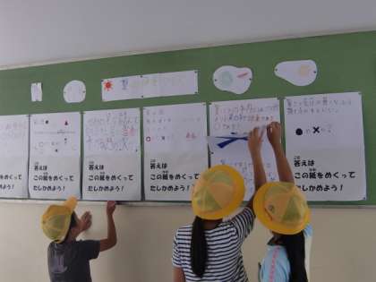 夏バテや熱中症を予防するために、どんな生活の工夫をすればいいか、〇か×で答えます。休み時間になると、保健室前を通る児童が、答をめくりながら「あたった!」「はずれた〜」などとクイズを楽しんできます。
