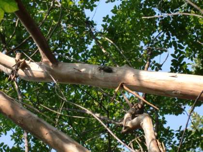 サルスベリを見上げると、大きなセミがとまって鳴いていました。(セミは、すべらないようですね)