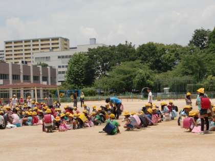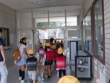 今日の下校は、全員運動場に集合したのち、分団ごとに並びなおし、分団下校をしました。災害発生等で、緊急に分団下校することが起こらないとも限りません。万が一に備え、このような取組みを行っています。遠くの分団から出発するため、すべての班が出発するまでに、かなりの時間がかかります。暑い中、出発待ちの児童はつらかったことと思いますが、指示をよく聞いて行動することができていました。