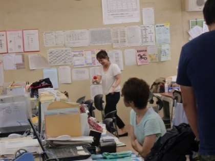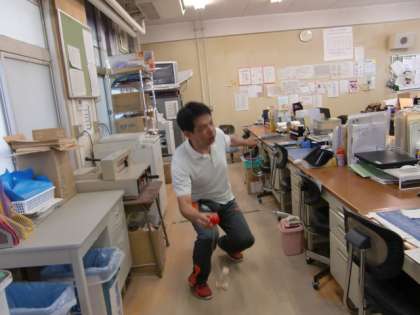 遊んでいるようにしか見えないかもしれませんが、れっきとした「研修」です。梅本教諭が「(もと)けん玉達人」であることが判明しました。「モシカメ」はすごいスピードでやってのけ、「ふりけん」や「とめけん」も、何度かのチャレンジで勘を取り戻し、見事成功させていました。