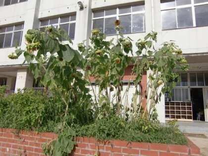 花が下を向いてしまっているのは、実をつけて重たくなってきているからです。2学期には、たくさんの種が収穫できるでしょう。楽しみです。
