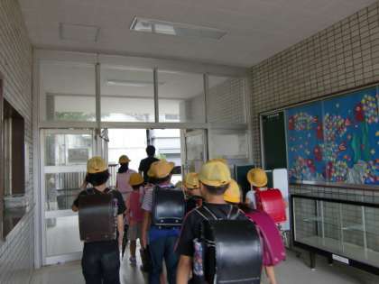 台風による風水害を想定しての避難訓練を行いました。学級での指導の後、分団の教室に移動し、通学路の安全確認等を行いました。