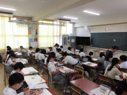 商品のパッケージの一部を切り取り、画用紙に貼り付けて残りの部分を色つくりを工夫して本物そっくりに描いていきます。