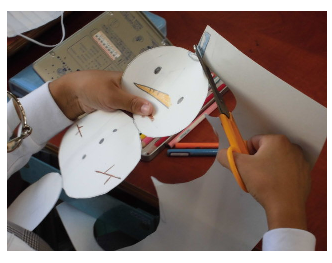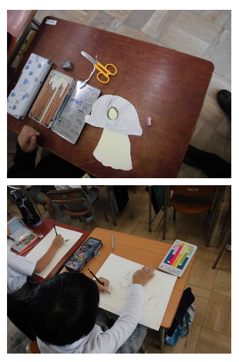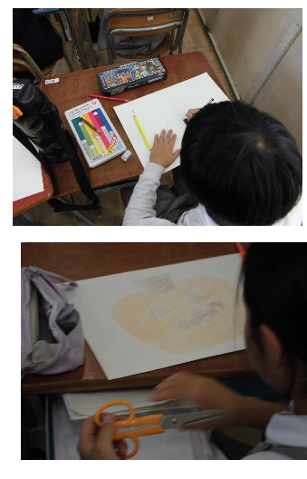 紙を好きな形に切り、裏と表に違う絵を描いて、2つの作品を仕上げていきます。