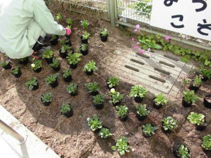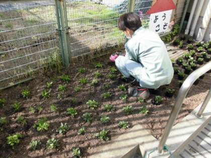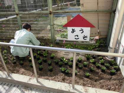 管理作業員さんが、玄関のお花の植え替えをしてくています。