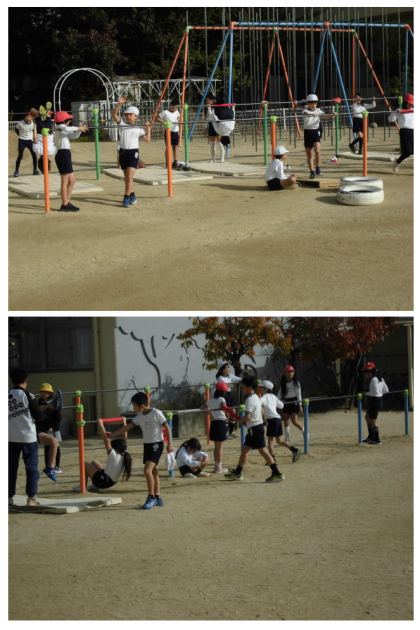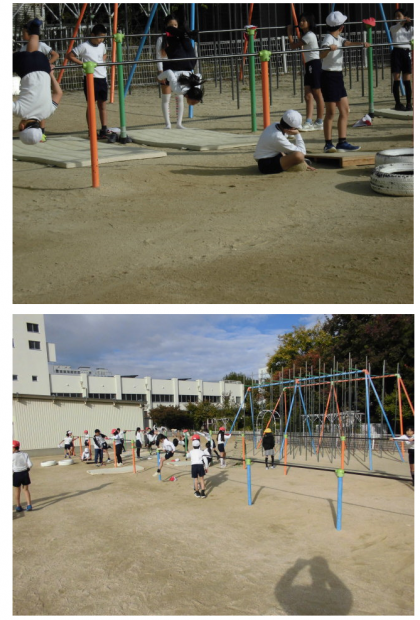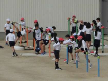 鉄棒運動が得意な子が、苦手な子にコツを伝えていました。
