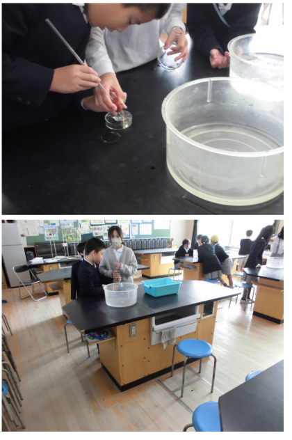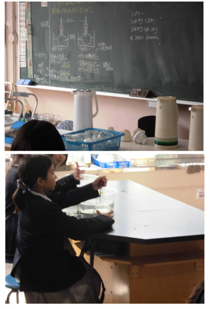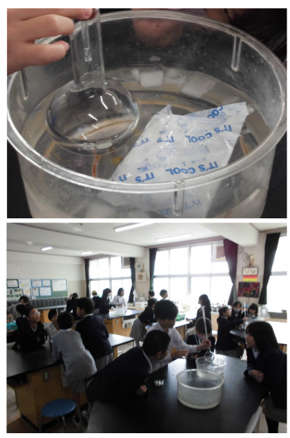 フラスコに差したガラス管の中のぜりー状のものが、フラスコを温めるとどうなるか、冷やすとどうなるかを確かめることで、温度と気体の体積についての関係を確認していました。
