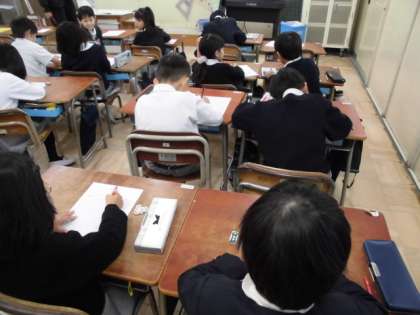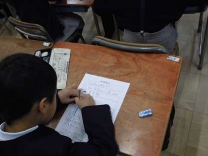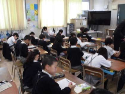 司書さんが、どんな仕事をしているのかを見つけて、ワークシートに書いています。