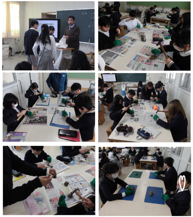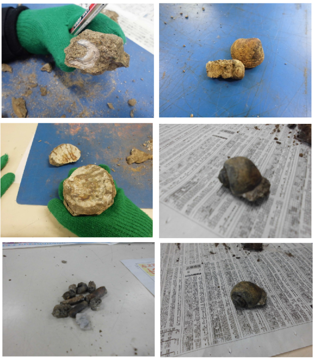 化石に対する基本的な学習の後、化石を含んでいる石を丁寧に割って入っている化石を取り出す作業を行いました。