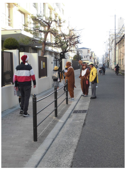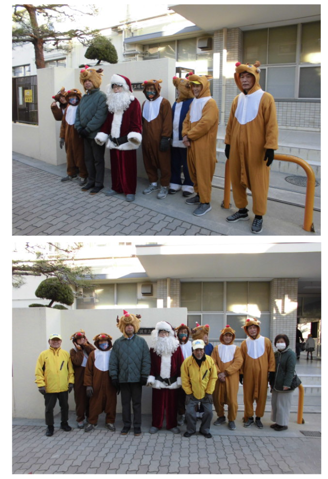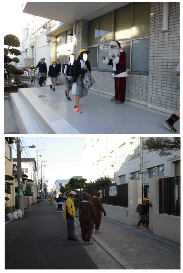 いつもは車で見守ってくださっていますが、2学期の終業式の今日はサンタのコスチュームで子ども達を迎えてくださっています。