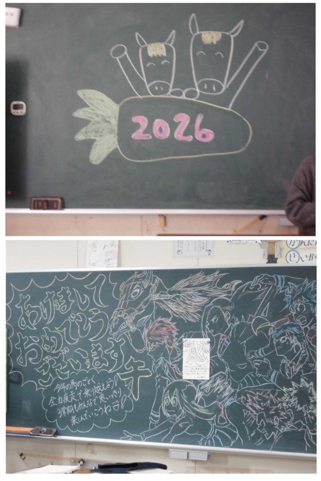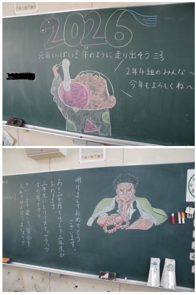 子ども達に向けて「新年のあいさつ」を先生が黒板に書いていました。