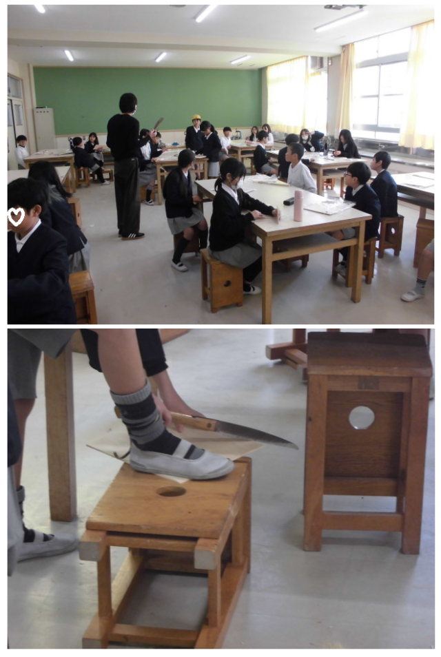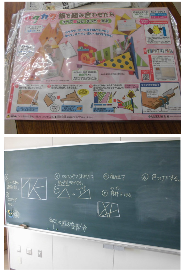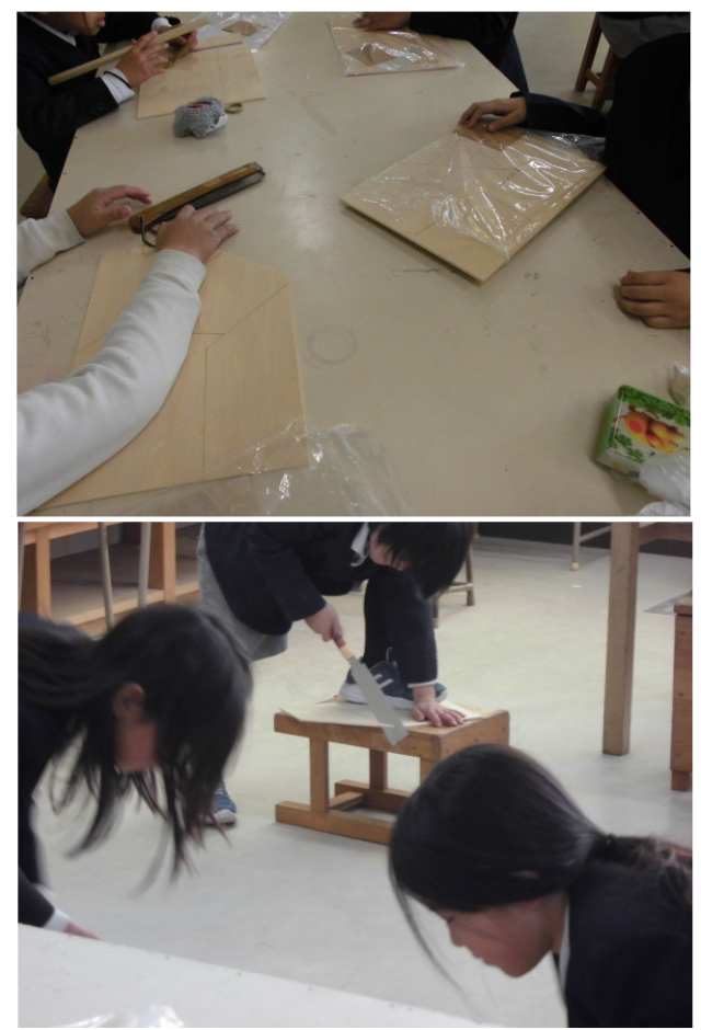 のこぎりを使って板を切り、組み立てて鉛筆立てなどを作ります。