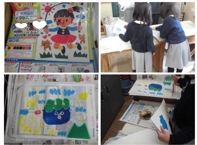 紙版画で一版多色刷り?と思ったら、紙を濡らして擦ると、色が紙に写る特殊なシールを使っていました。