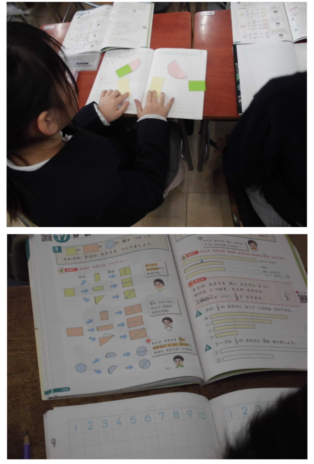 実際に紙を半分に切って、2分の1の大きさと意味を学びます。