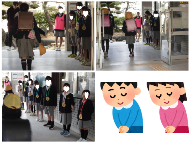 代表委員がタスキを、クラスのあいさつチャンピオンはメダルをかけて、朝のあいさつをおこなっています。