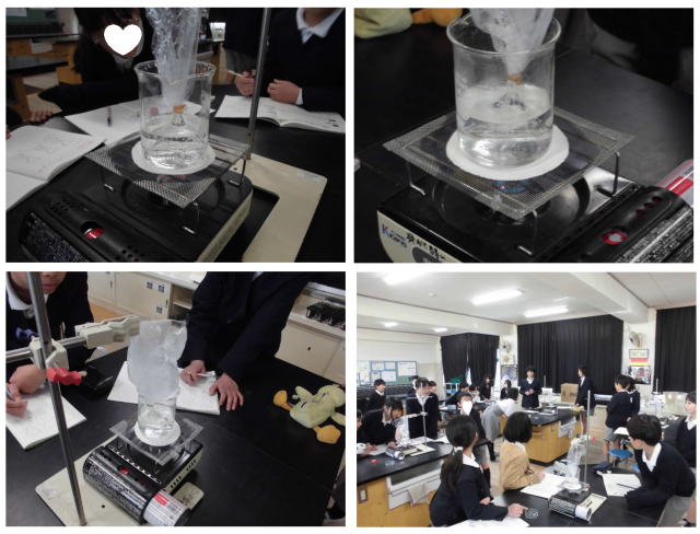 沸騰した水のフラスコの底からこから出る泡の正体を確かめる実験の様子です。