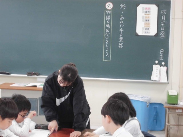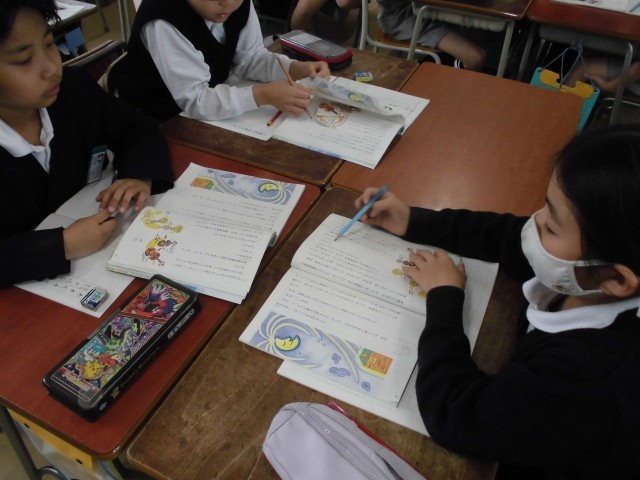 なぜここで場面が分かれるのか、自分の考えを班のみんなに話していました。