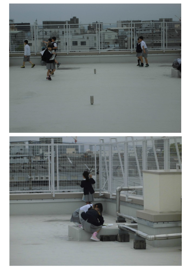 学校の周りの街の様子を屋上から観察している様子です。