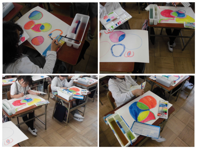 絵の具を使って、シャボン玉を描いている様子です。