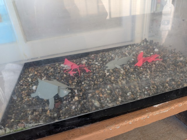 上手に切り絵をして、ザリガニやカメなどを作っていました。はやくメダカにも見せてあげたいですね!