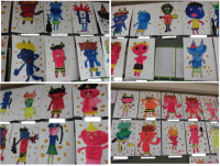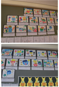 色鮮やかな作品が廊下に掲示されています。1年生は「スイミー」2年生は「オニ」どち...