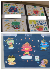 1年生の教室にオニが現れました。かわいいオニばかりで、ホッとしました。