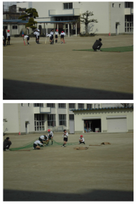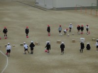 この冬最も寒い中でも子ども達は元気に運動場で活動しています。写真は1年生の体育の...