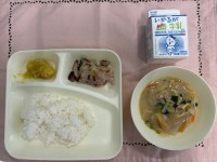 今日の給食は、・豚肉のスタミナ焼き・五目汁・きくなとはくさいのおひたし・ごはん・...