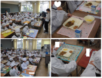 1年生にとって、初めての小学校の給食です。少しの間、6年生が給食のお手伝いをして...