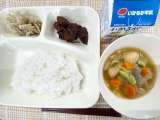今日の献立は、コッペパン・ブルーベリージャム・豚肉とごぼうの煮もの・なにわうどん...