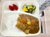 今日の献立は、チキンレバーカレーライス・きゅうりとコーンのサラダ・いちご・牛乳で...