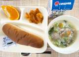 今日の献立は、コッペパン・ブルーベリージャム・えびのチリソースいため・中華がゆ・...
