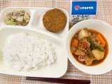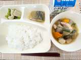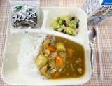 今日の献立は、チキンカレーライス(米粉)・ビーンズサラダ・ミニフィッシュ・牛乳で...