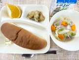 今日の献立は、コッペパン・バター・鶏肉のカレー風味焼き・洋風煮・はっさく・牛乳で...