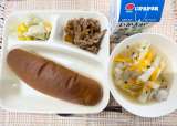 今日の献立は、黒糖パン・豚肉のデミグラスソース・スープ・カリフラワーとコーンのサ...