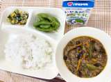 今日の献立は、ごはん・マーボーなす・チンゲンサイとコーンのいためもの・えだまめ・...