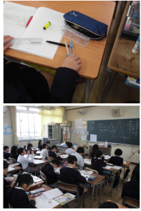 三角形の描き方の学習の様子です。コンパスを使って、三角形を描いていきます。慣れな...