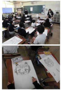 毛筆の学習の様子です。入筆の学習です。リズムよく、筆を動かしていました。丁寧にね...