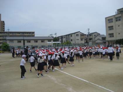 図工室から出火したという想定で、自分たちの教室から運動場へ全学年が避難しました。担任の先生の引率のもと、どの学級も静かに素早く非難することができました。非常ベルが鳴って避難を始め、全員の無事を確認するまでのタイムは昨年より30秒近くも早くなっていました。