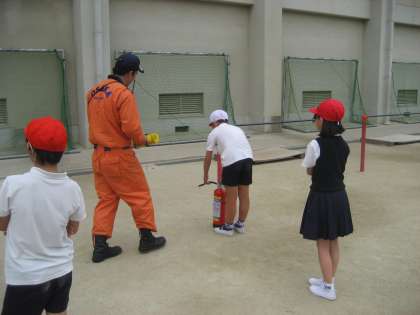 避難後、消防署から来ていただいた3名の署員の方に、消火器の使い方を教えていただきました。そのあと水消火器を使って消火訓練の体験を4〜6年生の代表の子たちがしました。いざという時に慌てず、今日学んだことを思い出して行動してほしいです。