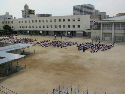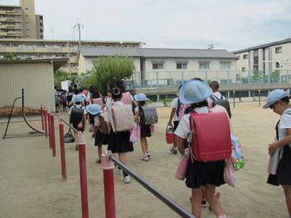 訓練では、地区別班の教室に移動し、その運動場に集まり、集団で下校しました。