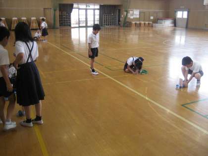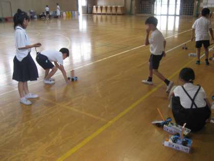 3年生になって理科での初めての実験に、子どもたちはみんな、はりきって取り組んでいました。送風機のスイッチを押す人、時間を計る人、車を止める人など班のみんなで声をかけあって協力していました。