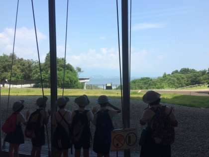 琵琶湖博物館を見学中です。活動班で活動しています。琵琶湖の働きや生き物、歴史の展示を見ながら学習したり、琵琶湖を眺めたりしています。