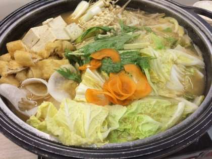 二日目の夕食は味噌鍋です。味噌ベースのだし汁に野菜がたっぷりと入っています。豚肉を加えひと煮立ちすると出来上がり。締めの麺も抜群です。5年生の皆さん、美味しいのはわかりますが、・・・食べすぎには注意ですよ!!