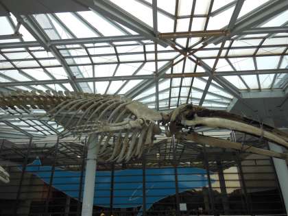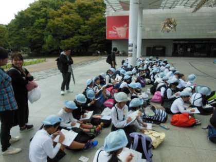 クジラの化石の標本をスケッチしました。自分の好きな色で描いたクジラを塗りました。