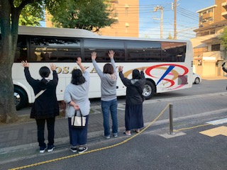 午前7時30分頃、保護者の方々に見送られて、いざ、スペイン村に出発です。