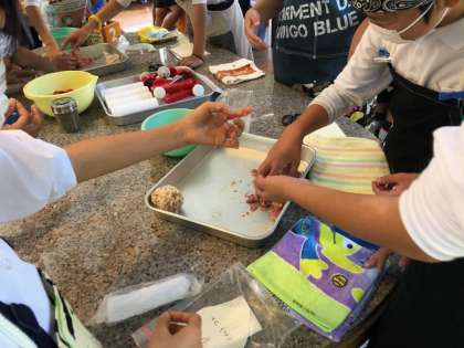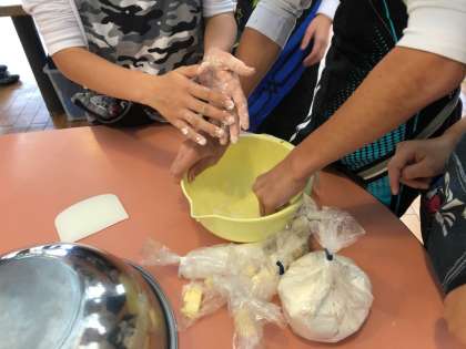活動班ごとにウィンナー・パン作り体験をしています。1から手作りでパンやウィンナーを作る体験は経験したことがない子どもが多いので興味をもって作っています。できたパンやウィンナーはお土産になるので楽しみにしてください。