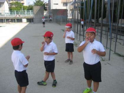 本日の一時間目に運動場でしゃぼん玉あそびをしました。