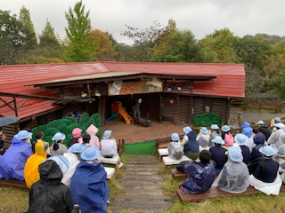 ミニブタショーが始まりました。雨は降っていましたが小雨程度になってきました。念のためカッパを着ています。子どもたちが活動を始めると雨が止んでくるのは本当不思議です。