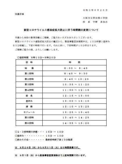 新型コロナウイルス感染症拡大防止に伴う校時表の変更について(茨田南小)